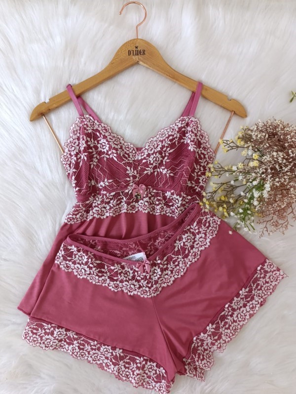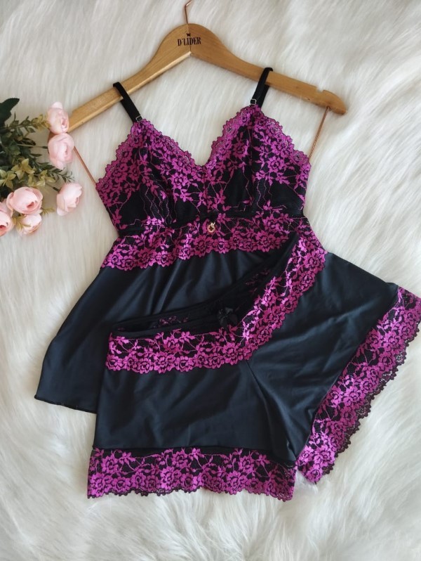 Baby doll com o corpo tecido elegance liso com detalhe de renda no busto , alcas parte reguláveis atrás . Acabamentos em lacinhos delicados na parte entre meio da base pingente com logo marca .