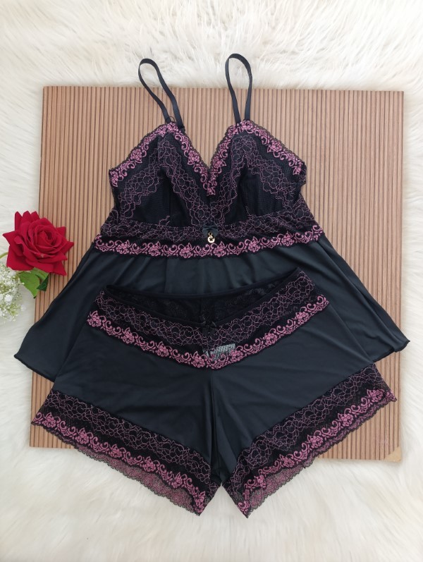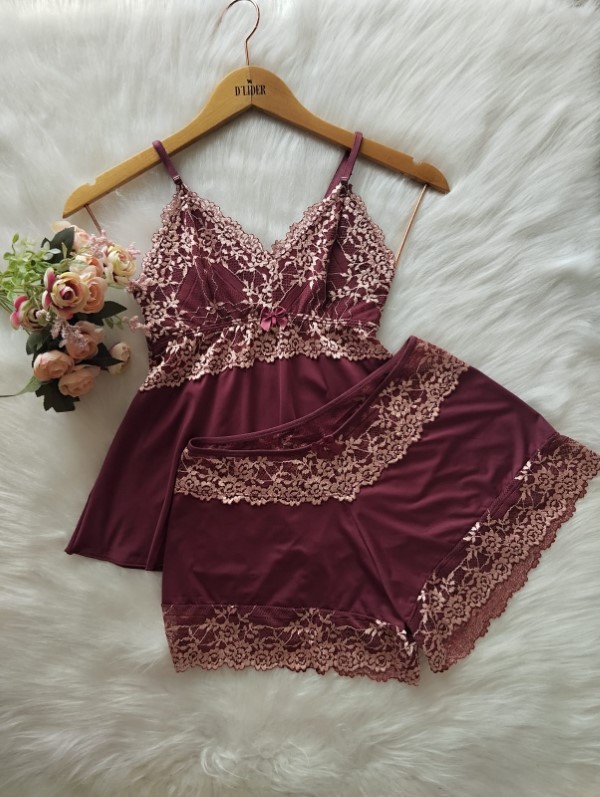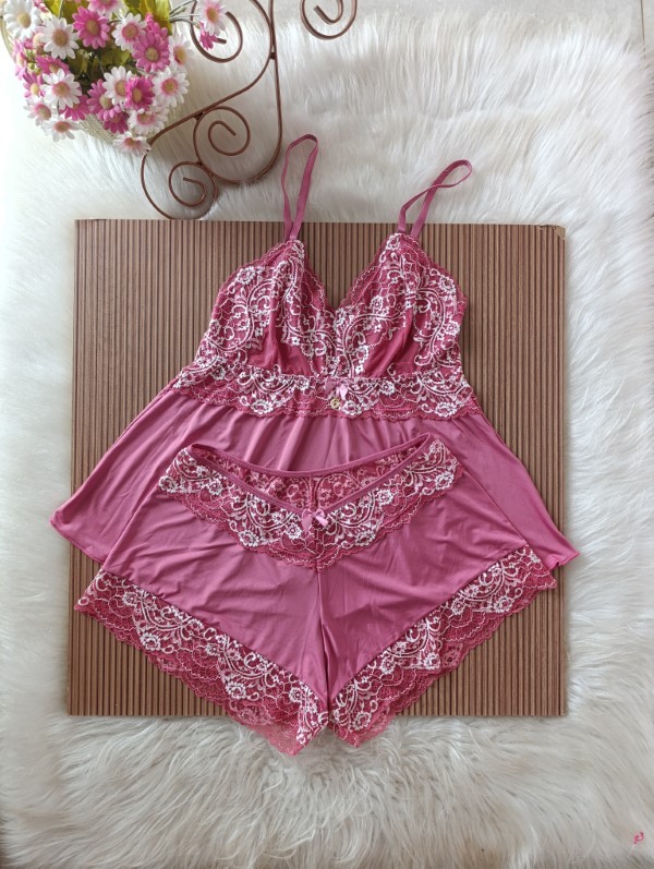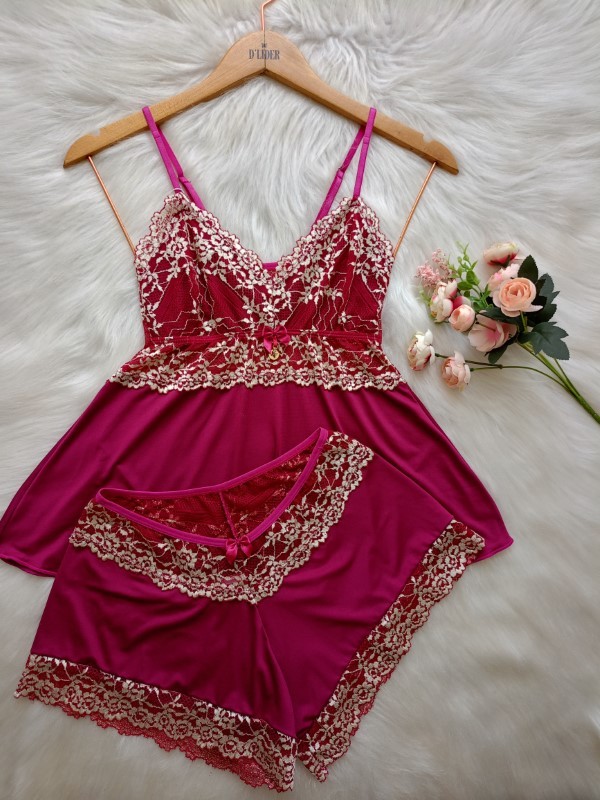 Baby doll com o corpo tecido elegance liso com detalhe de renda no busto , alcas parte reguláveis atrás . Acabamentos em lacinhos delicados na parte entre meio da base pingente com logo marca .