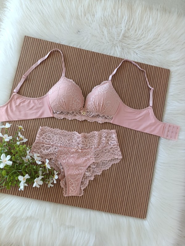 Sutiã com bojo coberto na renda ). Alças parte regulável atrás e laterais na micro fibra .