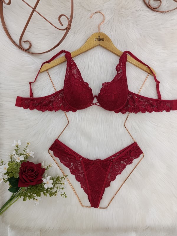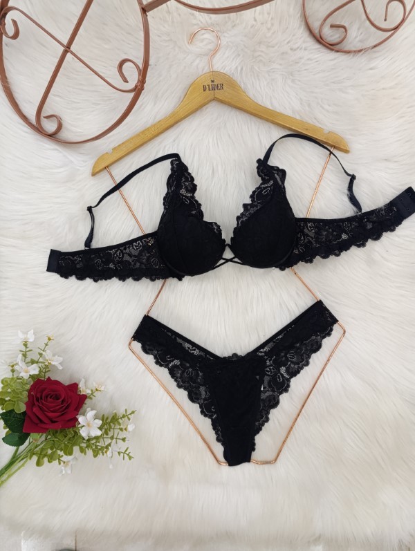Sutiã com bojo coberto na renda ). Alças parte regulável atrás e laterais na micro fibra .