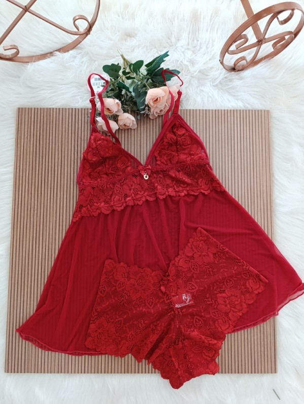 Baby doll com o corpo tele liso com detalhe de renda no busto , alcas parte reguláveis atrás . Acabamentos em lacinhos delicados na parte entre meio da base pingente com logo marca .